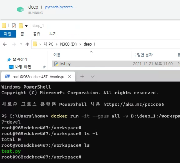 이미지를 생성한 deep_1 컨테이너가 D드라이브에 deep_1이라는 폴더를 기본 저장소로 사용하는 것을 확인할 수 있다.