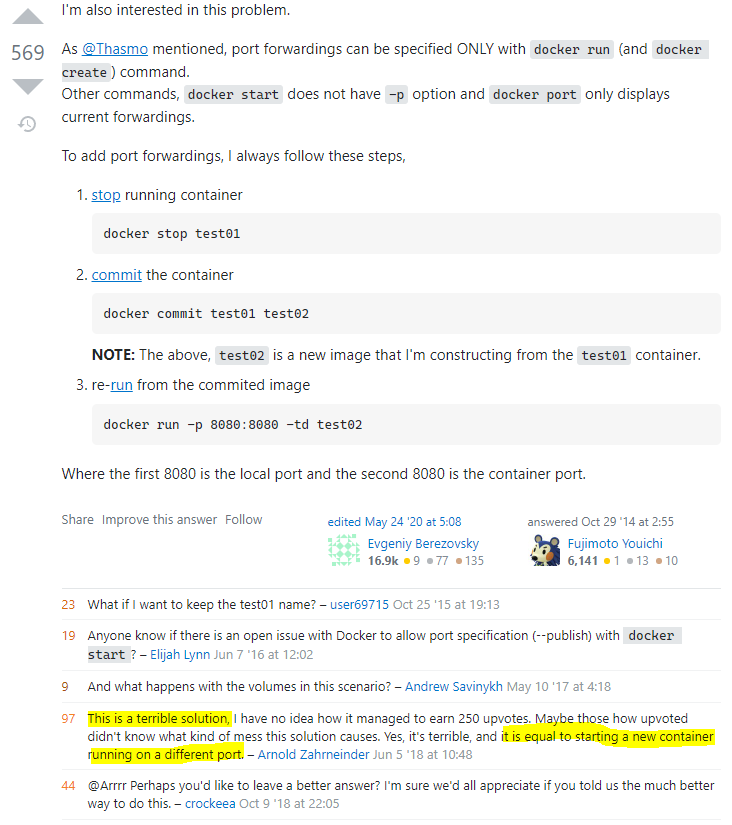 생성된 컨테이너에 포트를 추가하는 작업은 복잡한 것 같다. 특히 윈도우 환경에서 도커를 사용하는 경우는 아직 방법을 찾지 못하였다. 그 때문에 컨테이너를 생성하고 ssh 등을 활용할 생각이라면 꼭 생성할 때 포트를 개방시켜줘야 한다.