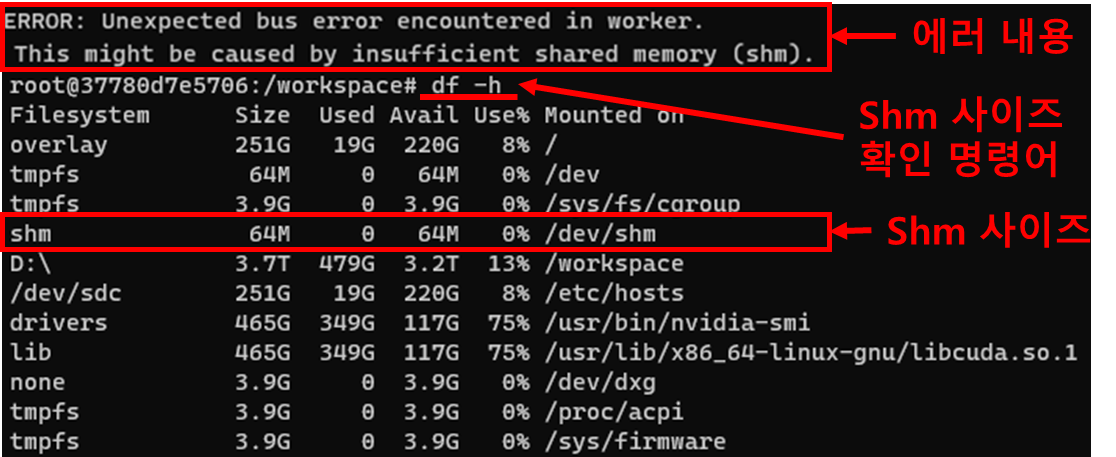 도커로 딥러닝 환경을 구축하고 훈련을 하면서 계속적으로 문제가 발생했는데, 이번에는 공유메모리가 부족하다는 메시지를 받았다.