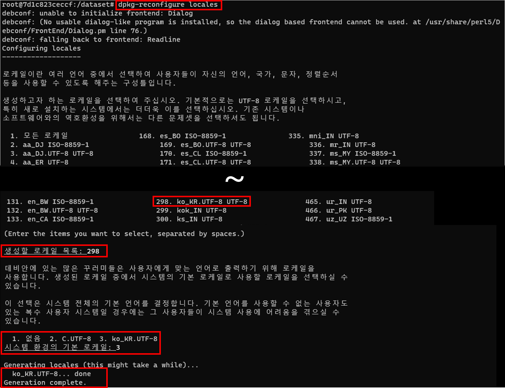 | locale-gen ko_KR ko_KR.UTF-8 update-locale LANG=ko_KR.UTF-8 |