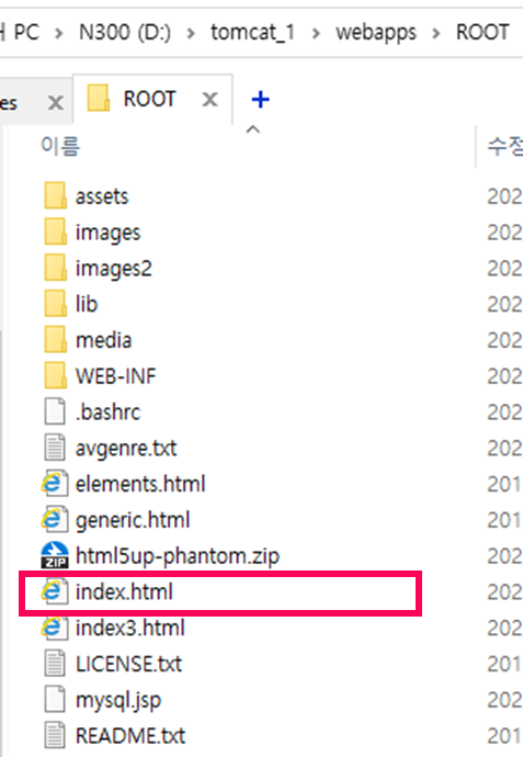 이 부분 때문에 살짝 애먹었는데, 간단합니다. webapps 폴더에 ROOT폴더를 만들고 그 안에 index.html 또는 index.jsp 파일을 넣으면 됩니다.