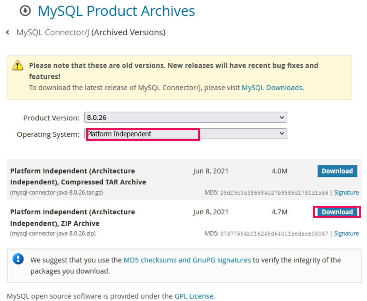 Please note that these are old versions. New releases will have recent bug fixes and features! To download the latest release of MySQL Connector/J, please visit MySQL Downloads. MySQL open source software is provided under the GPL License.