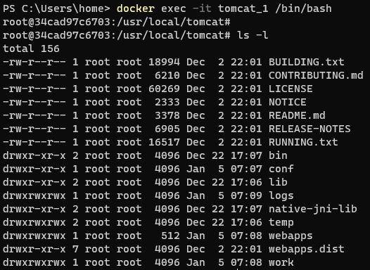 | docker exec -it tomcat_1 /bin/bash |