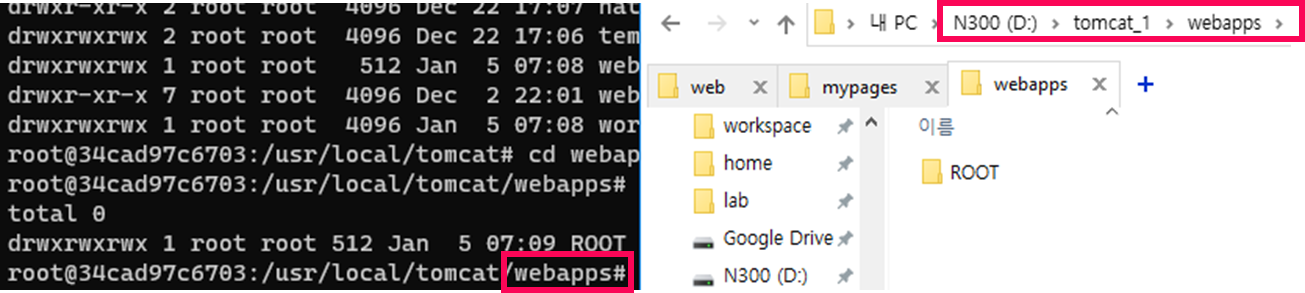 그럼 컨테이너를 생성할 때 '-v'을 주었기 때문에 d의 tomcat_1/webapps에 파일을 넣으면 컨테이너에도 똑같이 나타난다.