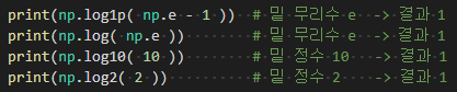 위 함수는 밑이 무리수 e인 자연로그이다. 때문에 np.e를 값으로 주면 결과로 1이 나온다.